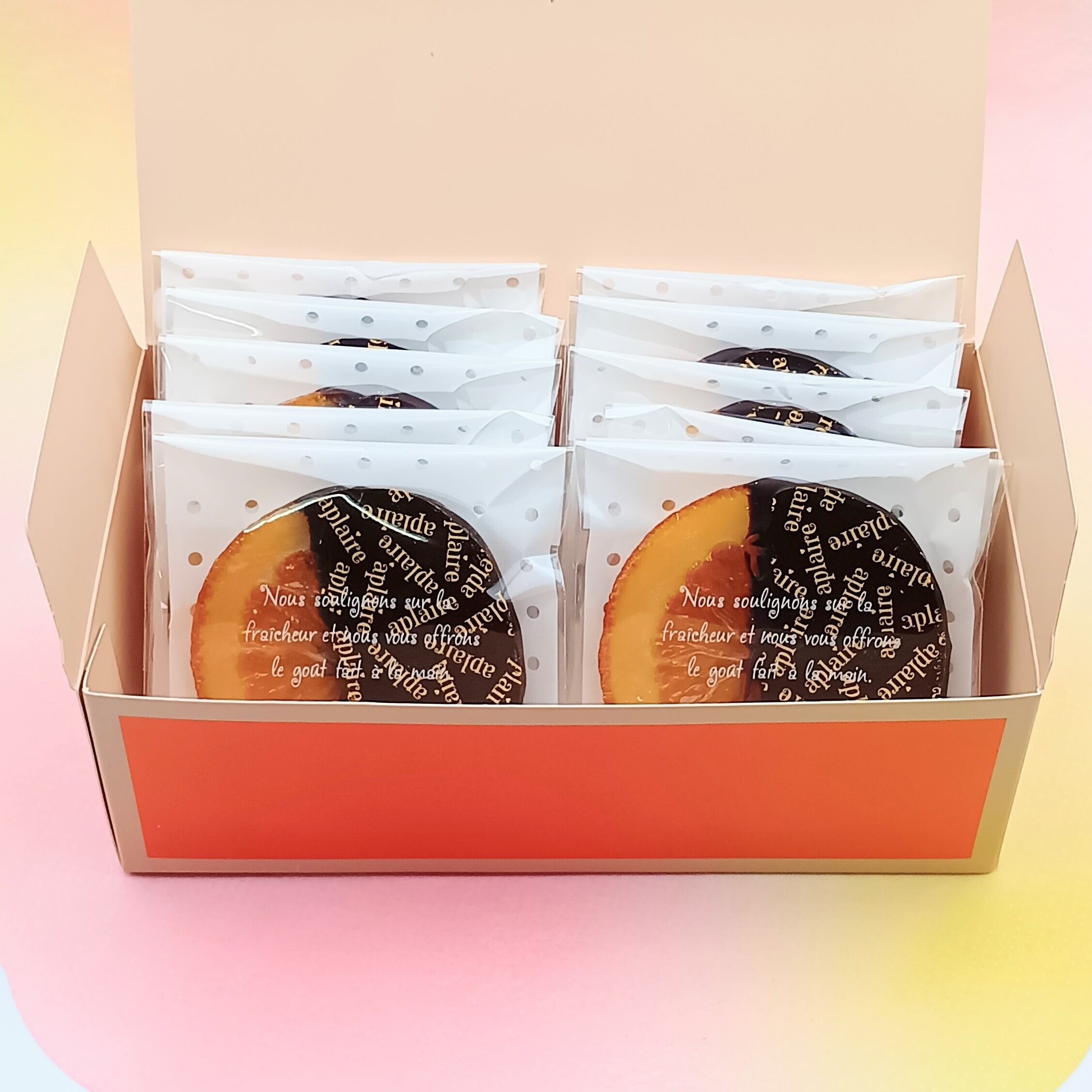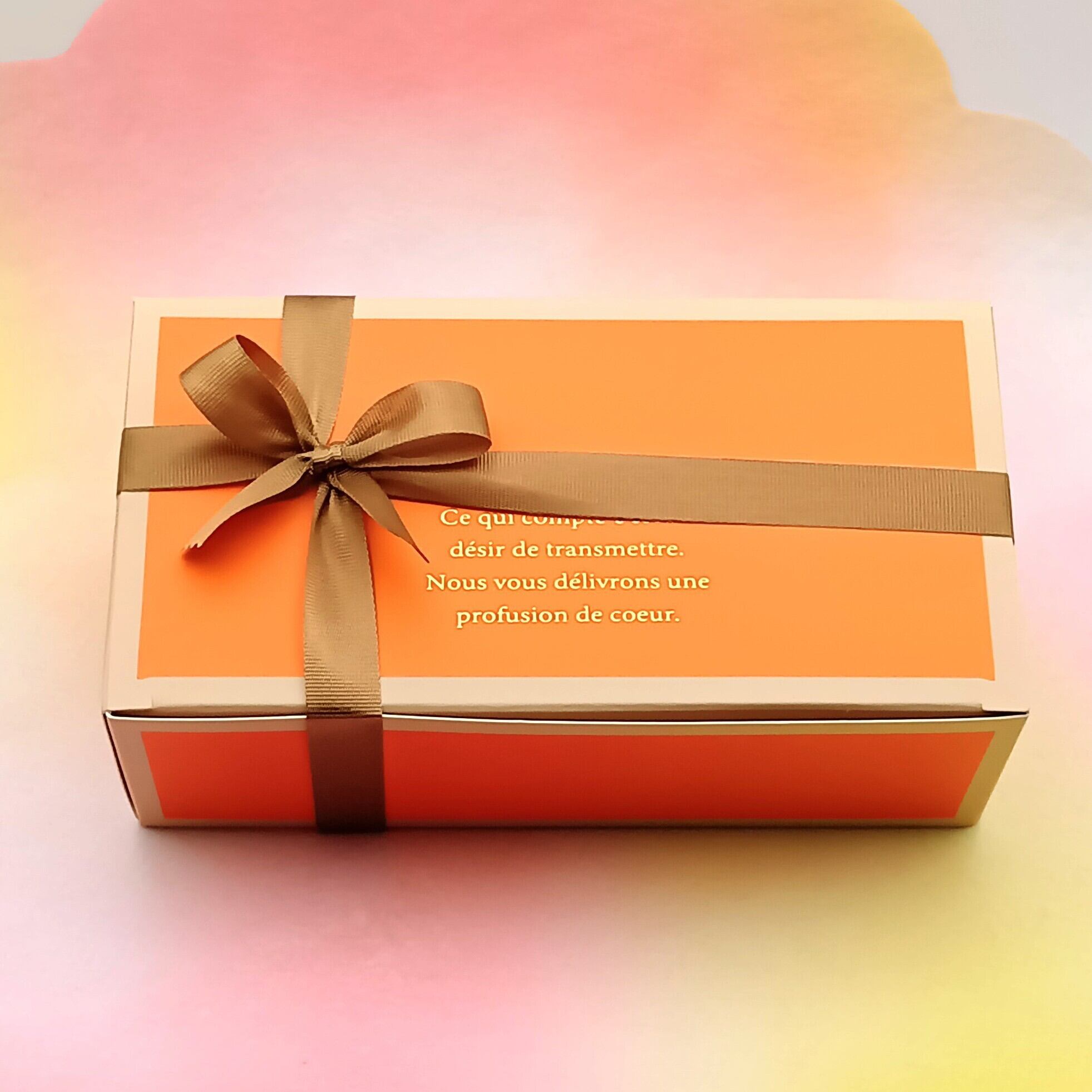 鮮やかな色合いの箱に10枚入っていますので、大切な方への贈り物やご自分への贅沢なプレゼントなどに、ぜひ当店のオランジェットギフトをお選びください。